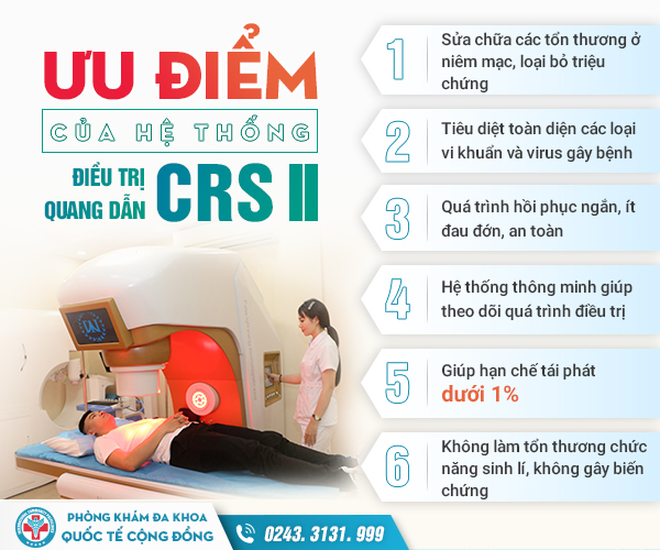 Để cải thiện hiệu quả tình trạng dương vật chảy dịch, hiện nay phòng khám Đa khoa Quốc tế Cộng Đồng đang áp dụng và thực hiện thành công phác đồ kết hợp hệ thống trị liệu quang dẫn CRS - IItiên tiến. Phác đồ này dựa trên nguyên tắc kết hợp thuốc Tây y, Đông y cùng hệ thống trị liệu quang dẫn CRS - II là chủ lực.